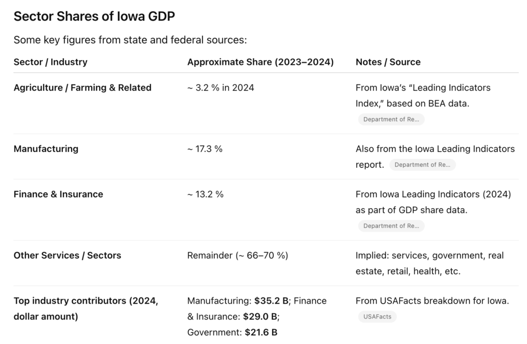 If you ask the average Iowan what sectors contribute to our economy, the answer is obvious, or should be, to anyone with the least amount of pride and knowledge (otherwise known as culture). Farming, finance, and manufacturing.