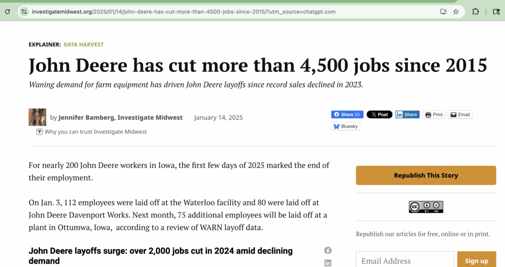 I mean, 2000 jobs cut by John Deere in 2024 alone, those are probably majority middle class families who lived and worked in this great state, buying things, spending money, working in our communities. One would have to imagine this will only get worse, not better in the near future.