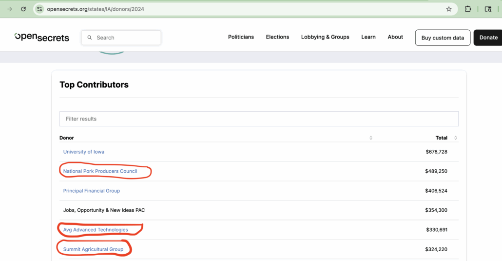 What else strange can we find, who is the second biggest donors in Iowa? National Pork Producers Council. Look who else makes it on the list close behind.